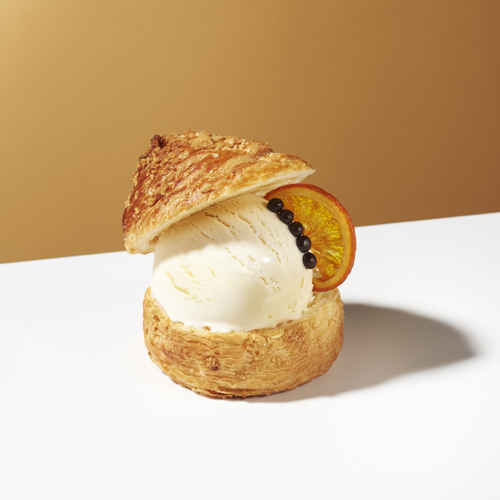 濃厚なバニラアイスクリームをレモンピールの香り広がるブリオッシュにのせ、ザクザクのクロワッサンの帽子をかぶせている。