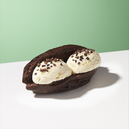 カカオのほろ苦さと中はモチモチ・外 はカリカリの口当たり。コク深いマカ デミアナッツアイスクリームに合わせて、隠し味に香り広がるココナッツを増量した特別なレシピのパンでお届け。
