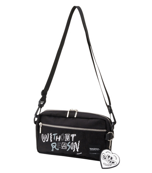 きりっとかっこいいブラックにインパクトのあるイラストをあしらったショルダーバッグ。コンパクトでありながら、長財布や500mlのペットボトル、携帯電話が収納可能!ショルダーベルトは取り外し可能。キーホルダーとしても使えるシリコンチャーム付き。
