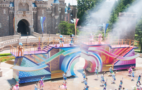 色鮮やかなフロートに乗ったディズニーの仲間たちは、カラフルなコスチュームを身にまとい、シンデレラ城前やパレードルート各所に停止しながら、振りかかる水しぶきでゲストを盛り上げる。ミッキーやミニーたちは威勢のいい掛け声や手拍子などでゲストをリードし、羽目をはずしてはしゃぐドナルドたちをデイジーとクラリスも応援し、会場全体もだんだんとヒートアップ。お祭りという特別な時間をともに楽しむゲストとディズニーの仲間たちがひとつになって、プログラムは最高潮を迎える。