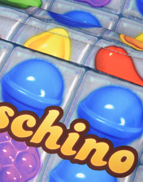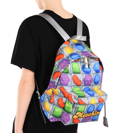 全面にキャンディーをプリントしたリュックサックは、外ポケット部分にキャンディークラッシュ風の“Moschino”のロゴ入り♪肩ベルトやファスナーはシルバーで統一したクールなデザイン。