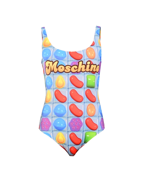 海やプールで注目を集めること間違いなしのワンピース水着は、胸元にキャンディークラッシュ風の“Moschino”のロゴをデザイン。