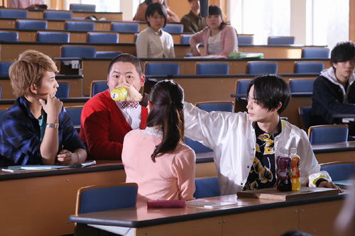 大学の教室にいるのは、気心の知れた仲間たち。そこに興奮気味に現れるのは、菅田くん。買ってきた 「ファンタ」みんなのキャラボトルを持って駆け寄りながら、1本1本を仲間のキャラクターに合わせて“ノリノリ”テンションで渡していく。