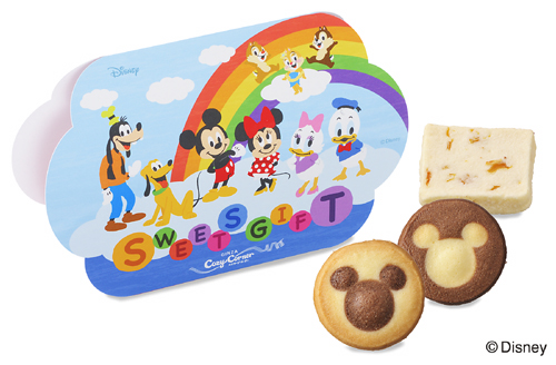 ミッキーのシルエット柄クッキー2種と焼きショコラを、ミッキーと仲間たちをデザインしたカラフルなパッケージにセット。
