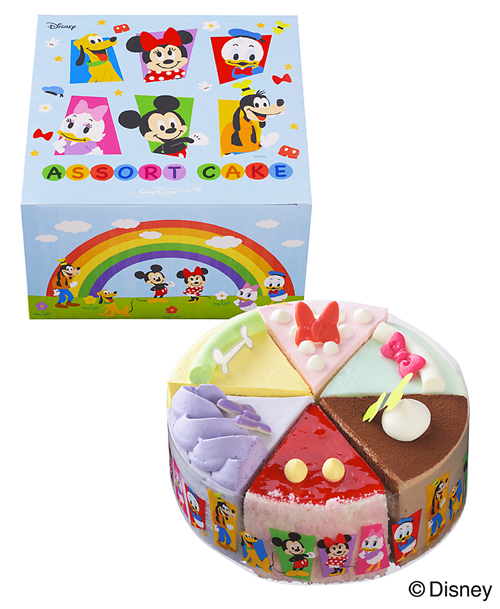 みんなが集まったら、6つの味わいを楽しめるディズニー・キャラクターのアソートケーキがおすすめ。チョコストロベリー、ブルーベリー、チョコバナナ、いちごみるく、チーズ、チョコ。どれを食べようか迷ってしまいそう!