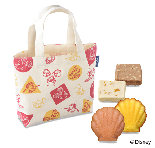マドレーヌ2種と焼きショコラ2種を、ポップなデザインのトートバッグにぎゅっと詰め合わせている。ミッキーと仲間たちのスケッチ調のデザインがとってもキュート!
