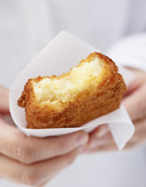 「スナックコロッケ」は、良質な北海道産ジャガイモ「トヨシロ」のダイスカット(ハッシュ)とペースト(マッシュ)を混ぜ、ジャガイモならではのホクッとした食感となめらかさを味わえる新食感のコロッケ。