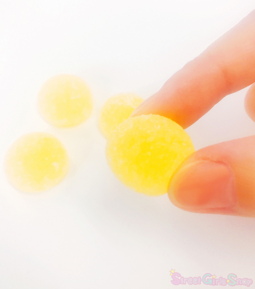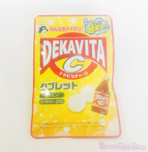 7種のビタミン(ナイアシン、パントテン酸、ビタミンB1、ビタミンB2、ビタミンB6、ビタミンB12、ビタミンC)とローヤルゼリーエキスが配合され、パッケージをあけると、「食べると元気でるよ〜」っと言われているようなデカビタCそのものの香りが広がる。