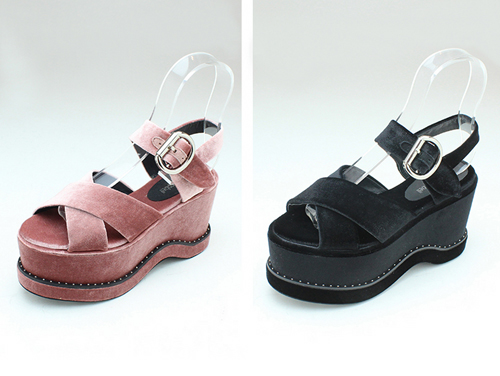 本シューズは、この秋冬のレンド素材の一つでもあるベルベットを使った、光沢や質感が美しい厚底サンダル。カラーはベーシックに何にでも合わせやすいブラックと、クラシックなカラーリングが可愛らしいピンクの2種類。