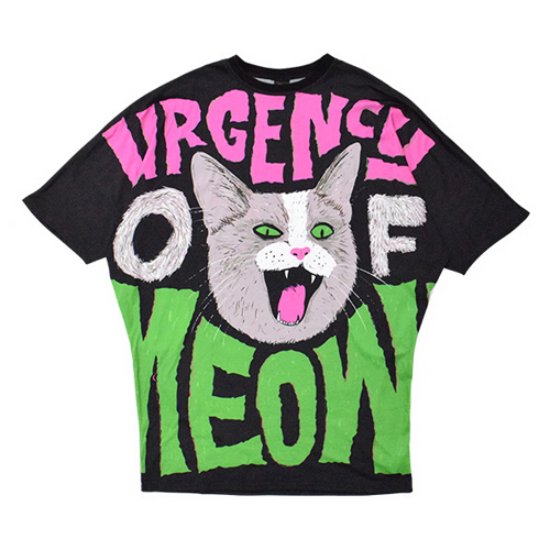 アーティスティックなド派手プリントな「MEOW Tシャツ ワンピース」。前に大きな文字ロゴ&にゃんこ、そして後ろにも文字ロゴ&にゃんこがプリントされたユニセックスでも着られるサイズ&デザイン。
