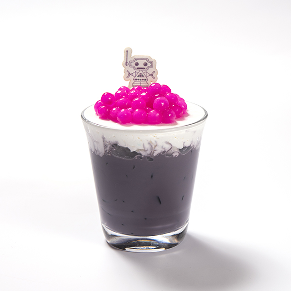 バルタザール特製、巨大にふくらむバブルガ ムをイメージしたパープルのミルクティ。 相棒ロボットの”クライヴ”と、ピンクのバブル ガム風タピオカと一緒に「DANCE BATTLE!」♪