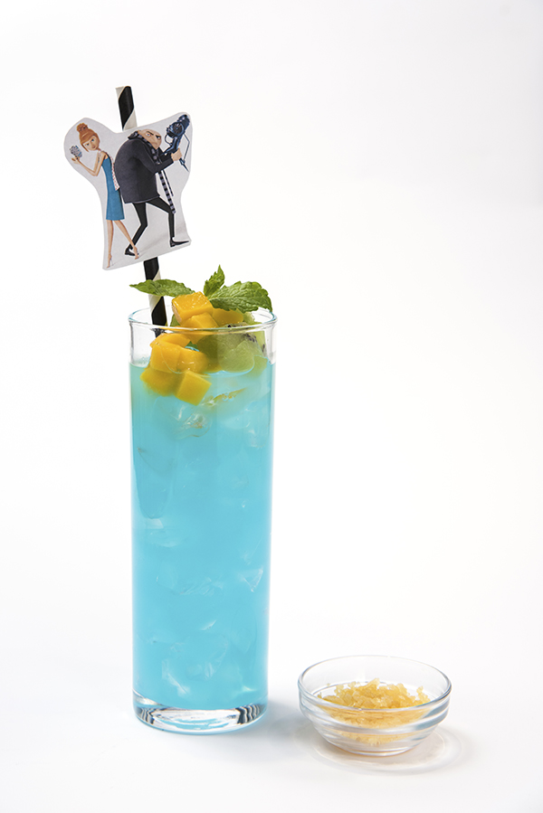 ナイスコンビのグルーとルーシーをイメージしたドリンク。グルーの銃で凍ってしまったフルーツと、ルーシーの銃のようにパチパチ・ビリビリするキャンディを入れて召し上がれ♪