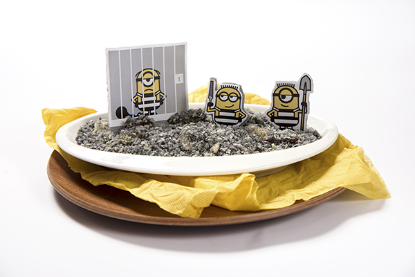 最新作「怪盗グルーのミニオン大脱走」では、ミニオンたちがタイホされちゃう!? 刑務所に入れられちゃった?? 囚人服風オーバーオールのミニオンがカレーライスになって登場!