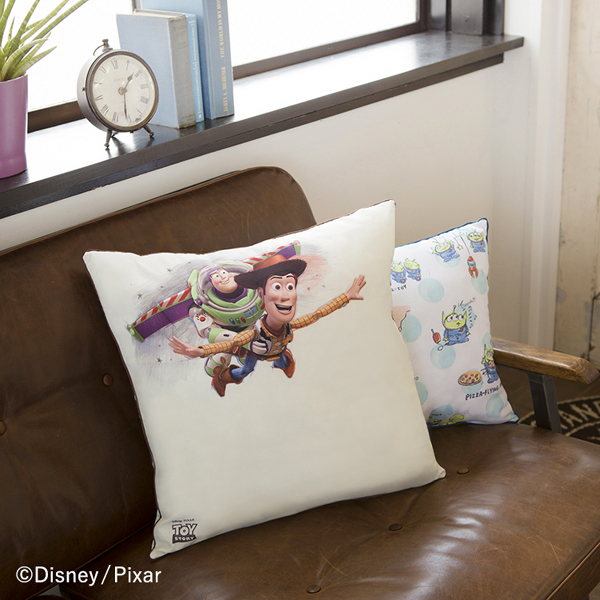 「トイ・ストーリー」に登場する「ウッディ」と「バズ・ライトイヤー」をスケッチ風にデザインした約50cmのビッグクッション。