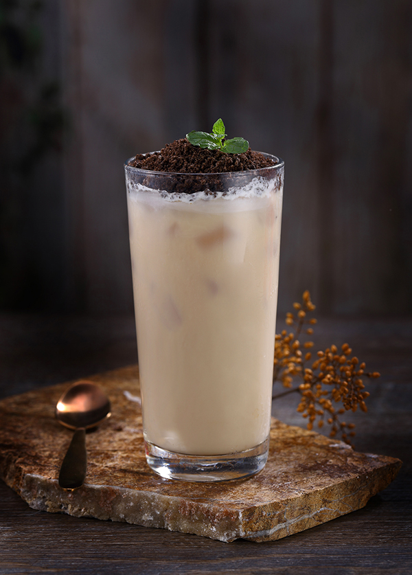 盆栽をモチーフに、遊び心溢れる名物「盆栽ミルクティー」。濃厚なアッサムミルクティーベース。