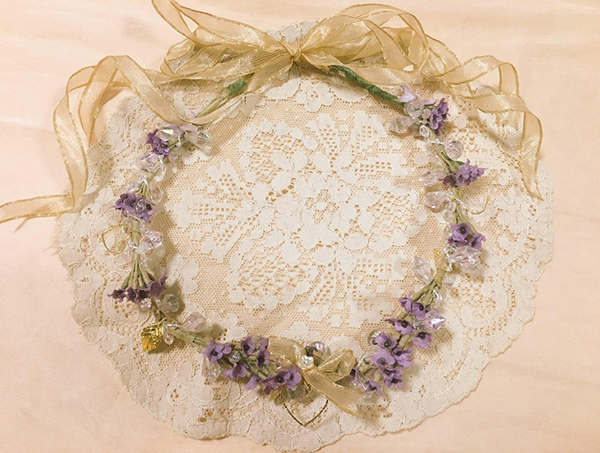 古いラベンダーで制作したリースのようなネックレス。花冠のようにヘッドドレストしても使用可能。