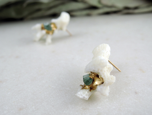 天然の珊瑚と、荒削りの鉱物とを日本の伝統的な金継ぎの技法でジュエリーに。希少性の高いアフガニスタン産のインディゴライトトルマリンの原石を使用し、まるで海の水を凍らせたかのような美しいブルーグリーンが特徴的。