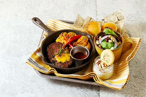 ビーグル・スカウトたちのサマーキャンプにもっていきたい!サマーキャンププレート!スキレットであつあつのハンバーグとグリル野菜には、ガーリックオニオントマトソースをたっぷりつけて召し上がれ♪