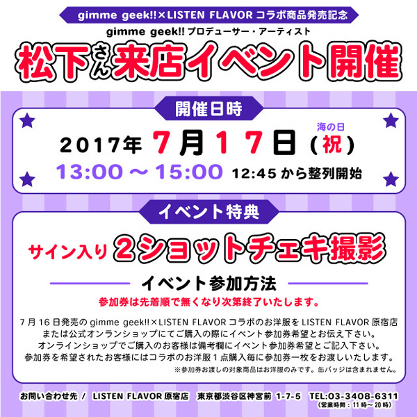 gimme geek!!×リッスンフレーバーコラボ発売を記念して、gimme geek!!プロデューサー&アーティストの“松下”がリッスンフレーバー原宿店に来店するイベントが7月17日(祝・海の日)に開催する。