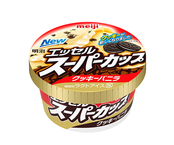 アイスクリームの中でも人気フレーバーであり、「明治 エッセルスーパーカップ」シリーズでも、人気の高いフレーバー「クッキーバニラ」がさらにおいしくなって再登場♪