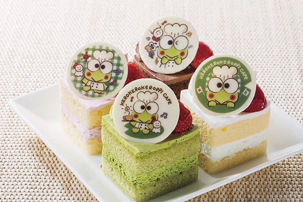 4つのプチケーキ、生クリーム、ストロベリー、チョコ、抹茶がセットになったバースデーケーキセット。やっぱりけろっぴカラーの抹茶の緑は見逃せない!