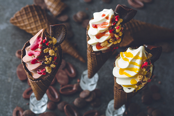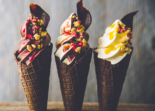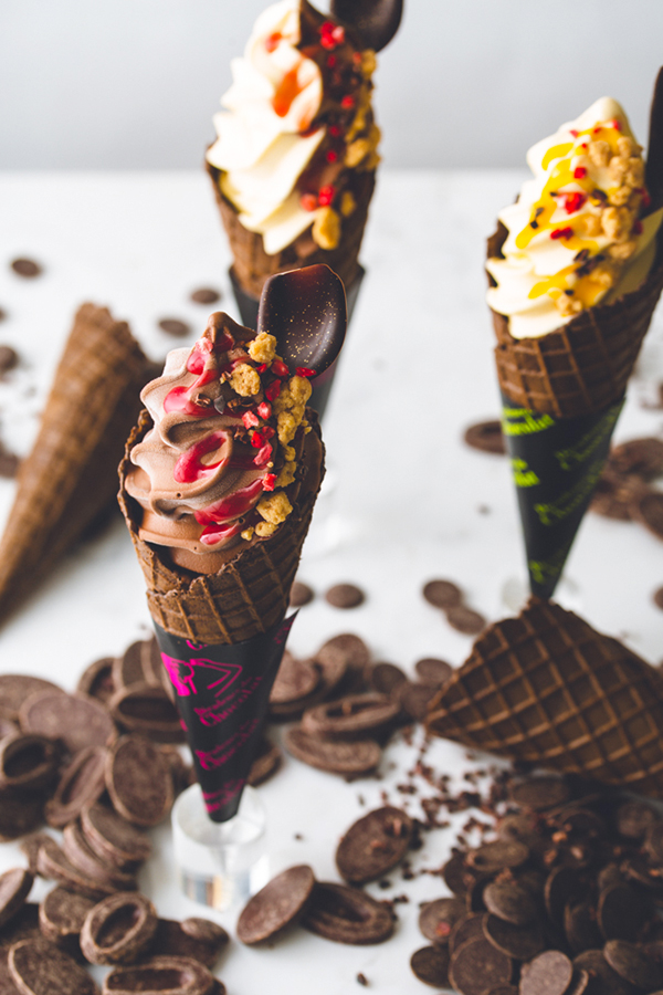 ラインアップは、chocolat(ショコラ)、vanille(バニーユ)、Mix(ミックス)の全3種類。ソフトクリームの上には、鮮やかなソースやトッピングをオン♪ 仕様は、コーンとカップの2つからセレクト可能。