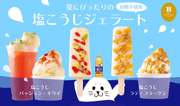 美容や健康に効果的なフルーツや野菜、ビタミンやミネラル豊富なはちみつを使い、砂糖不使用のヘルシーな手づくりジェラートを提供するBUON'AMOREより登場するコラボメニューは、ミルクの濃厚なコクが味わえる「塩こうじラテ・コラーゲン」と、すっきり爽やかな柑橘系ソルベ「塩こうじパッション・キウイ」の2シリーズ全5品。
