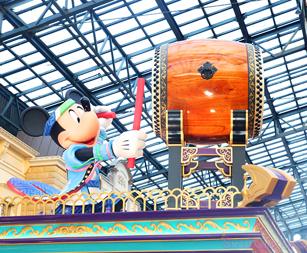 ワールドバザールの中央にはやぐらが登場し、その上で和太鼓をたたくミッキーと、ディズニー映画「ファンタジア」に登場するほうきたちがやぐらの周りでうちわを片手に踊る様子を表現したデコレーションも新登場!キャラクターと同じポーズで踊りに参加しているような写真を撮ってみてね♪