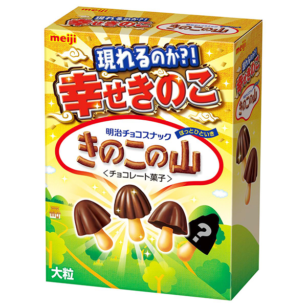 食べたら幸せになれるはず☆ 大粒で“しわ”がたくさん刻まれた『現れるのか?! 大粒幸せきのこの山』新発売!たけのこも紛れ込んでいるかも…⁉
