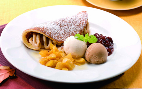 どら焼き風にうすく焼き上げたパンケーキ生地でなめらかな口当たりの栗クリームとホイップクリームをふんわりと包み、栗の甘煮やゆであずき、アーモンドが香ばしいコクのあるマロンプラリネアイス、バニラアイスなどを盛り合わせた、デニーズオリジナルスイーツ「栗のどらパンオムレット」。上品な甘さとふっわふわの生地&クリームが後を引く美味しさ。