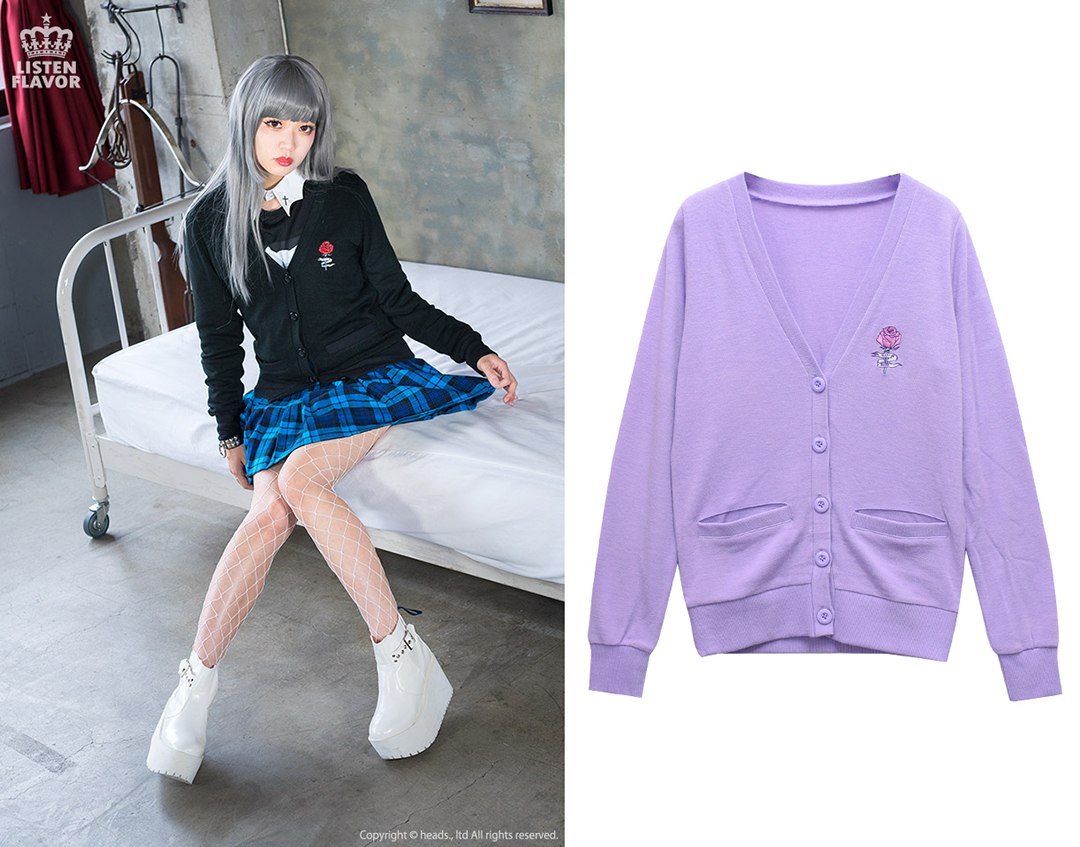胸もとに愛らしい一輪のバラが咲くVネックのニットカーデは、さっと羽織れて時間や天候によって気温の変化しやすい季節の変わり目に大活躍!もちろん、制服の上にもマッチするよ~♡