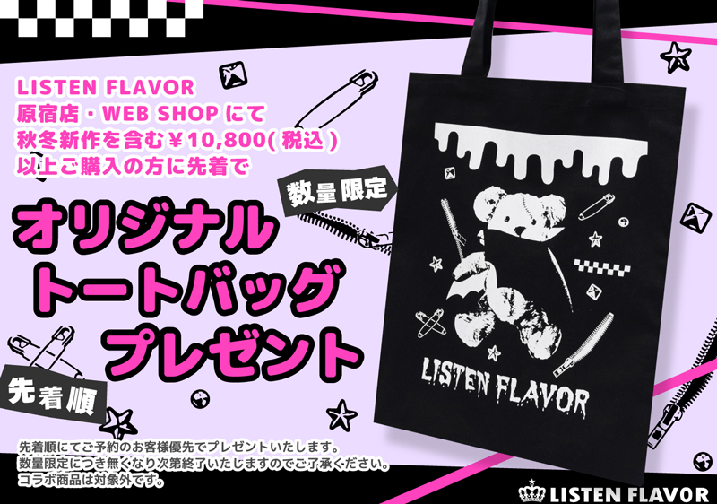 条件:リッスンフレーバー公式通販・原宿店・楽天WEB SHOPにて、2017秋冬新作アイテムを含む10,800円(税込)以上の購入