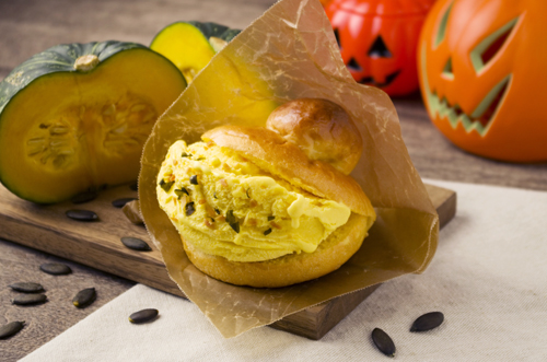 かぼちゃの自然な甘みとパンのホクホク感がおいしい『かぼちゃのジェラート』 は、最もリッチなパンと言われるブリオッシュに、旬の野菜・かぼちゃをふんだんに混ぜ合わせたバニラジェラートを挟んだスイーツ。