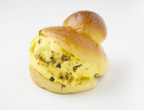 かぼちゃの自然な甘みとパンのホクホク感がおいしい『かぼちゃのジェラート』 は、最もリッチなパンと言われるブリオッシュに、旬の野菜・かぼちゃをふんだんに混ぜ合わせたバニラジェラートを挟んだスイーツ。