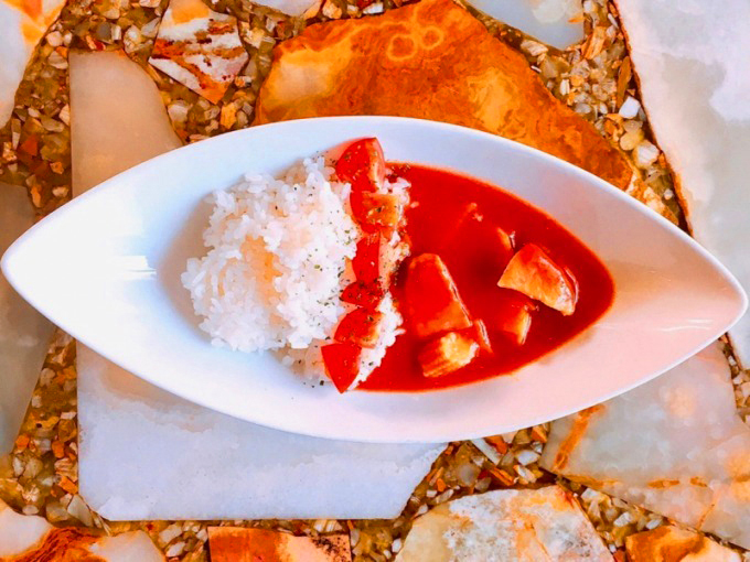 熊本産トマトと数種類のスパイスを配合したカレー。セットにはサラダとドリンクが付いてくる。