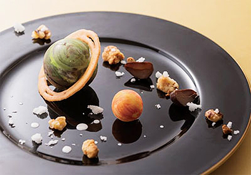 昨年に続き“球体モンブラン”の第2弾が登場。今年は「球体=惑星」をイメージ。惑星に見立てた球体型チョコレートの中には、マロンクリームとメレンゲを忍ばせて、惑星の周りの“環”を、チュイールで再現。渋皮栗やナッツ、クッキーに似たさくさくとした食感のシュトロイゼル、ミルクのグラニテを隕石やスターダストに見立てて、宇宙空間をこの一皿で表現。
