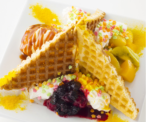 ワッフルをたてて、3方面から種類の異なるバラエテイにとんだ、季節のフルーツや生クリーム・ソースでそれぞれの味が楽しめます。お好きな種類のトッピングでお楽しみ下さい。仕上げはマンゴーパウダーをまぶします。