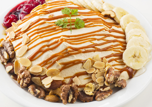 生クリーム・キャラメル・バナナをブレンドした特製クリームに、バナナ・チョコ・アーモンドなどをトッピングしたボリューム満点のパンケーキ。