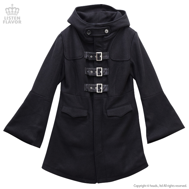 美しいAライン、大きく広がるベルスリーブ、首をすっぽり覆うスタンドカラーが作るシルエットはまさしく魔女のローブ☆ 3本の太いベルトがついて、ゴシック感漂う本格仕様のコート!