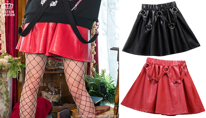 フェイクレザーのツヤ感とハリのあるボリューム感にハーネス風ベルトがアクセントになって、スパイスの効いた辛口コーデにぴったりのちょっぴりハードなサーキュラースカート☆