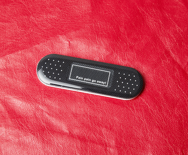 スマートフォンの背面に貼り付けて使う、絆創膏をモチーフにしたホルダー。ブラックでシンプルだからこそ、どんなカバーにもよく合う。