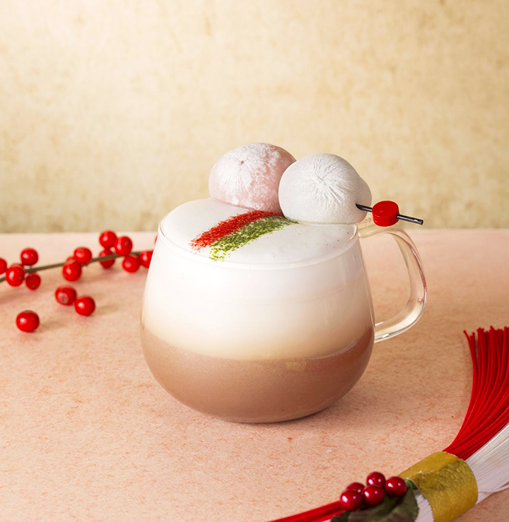 「おしるこカプチーノ ~ ミニ紅白大福添え」は、セガフレードのエスプレッソを加えた“おしるこ”に、きめ細やかなカプチーノフォームを乗せ、味わいと彩りのアクセントに抹茶パウダーとフリーズドライストロベリーを振りかけた後、紅白のおめでたいミニ大福をトッピング。