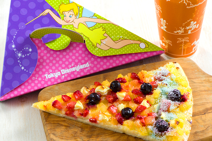 色鮮やかなフルーツとなめらかなカスタードがのった、「ティンカーベリーピザ(フルーツ&カスタード)」はティンクが魔法の粉をふりかけたみたい♡ お持ち帰りしたいほどのキュートなパッケージを開けたら、さっそく食べてしまいたいところたけど、並べて写真撮影もお忘れなく☆