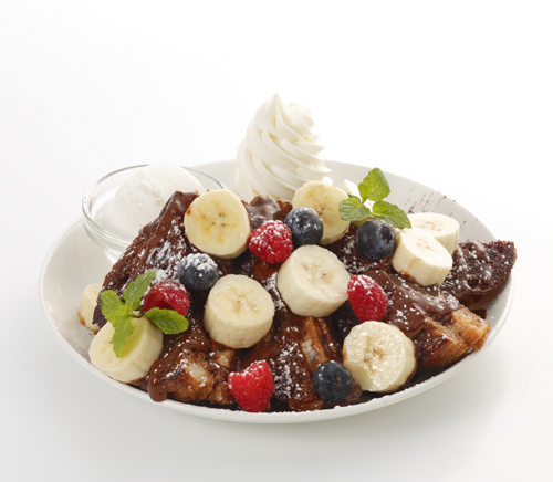 アパレイユにカカオ分55%のクーベルチュールチョコレートを使用したフレンチトーストに、マスカルポーネチーズとバナナスライスをサンドした「チョコバナナ」は新メニュー。チョコレートとバナナ、ラズベリー、ブルーベリーを飾った少し大人な味わいに仕上がっている。