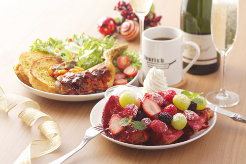 この季節に合うクリスマスカラーの「ベリークリスマス」は、クリームチーズをはさんで焼き上げたフレンチトーストにストロベリーソースとラズベリーソースをかけ、ストロベリー、トンプソンブラックベリーを飾った季節限定のスイーツ。