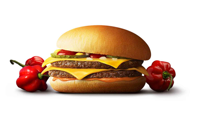 ハバネロの辛みが効いた絶妙ピリ旨ソースが特長の「ピリ辛ダブルチーズバーガー」は、ピリッとスパイシーな味わいがクセになる一品。