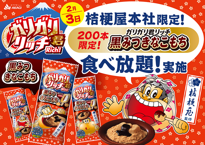 内容:13:00~13:30 ガリガリ君 桔梗屋1日工場長 任命式、13:30~ 「ガリガリ君リッチ黒みつきなこもち」食べ放題を実施(200本限定、なくなり次第終了)、14:00~14:20 ガリガリ君が工場見学に登場