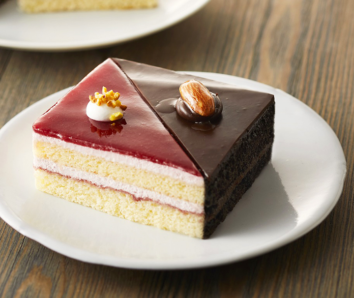 コーヒーと相性の良いコクのあるショコラと、紅茶にも合う甘酸っぱい風味のフランボワーズの2種類のケーキを一つにして、スクエア型に仕上げた一品。「異なる味わいを、少しずつ楽しみたい」という気分の時にもピッタリ。それぞれのケーキと、ドリンクとのペアリングを存分に楽しんで♪