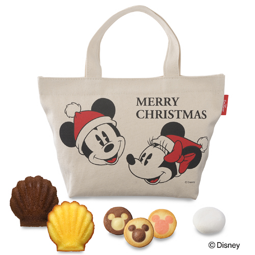 サンタ帽をかぶったミッキーとミニーをデザインしたトートバッグの中にマドレーヌやクッキー、チョコ入りマシュマロが詰まってるよ。