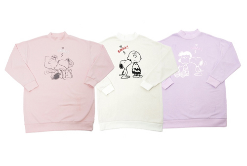 今年の秋冬に原宿系女子の熱視線が注がれる、大人気のパステルカラーのスウェットはビックサイズで登場。ピンク、ホワイト、ラベンダーの3色それぞれ施されているプリントが違うところがポイント。チャーリー・ブラウンやルーシーにキスするスヌーピーが描かれてるよ。